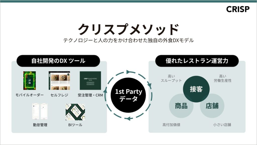 その一方、CRISPの真の姿は単なるカスタムサラダ専門店に留まりません。「日本の外食を、ひっくり返せ。」をパーパスにかかげ、自社開発の店舗運営OS(オペレーティング・システム)を擁する「フードテック企業」として、外食産業のオペレーション最適化・コスト構造改革にも取り組んでいます。CRISP独自のDX手法「クリスプメソッド」は店舗経営において特に重要な要素となる各工程に1st Party データやAIを活用したDX手法を導入し、テクノロジーを活用した経営意思決定力により、事業成長の再現性を高めるものです。本ファンドでは、この同社が持つ独自のデータとテクノロジーがファストカジュアル市場における事業成長を加速させるコアバリューであると評価し、同社への支援を決定しました。